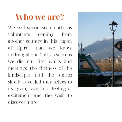 We are two french folks and in March 2022, we discovered Greece for the first time. From France, we already had images from this country in mind: postal cards from Santorini, countless islands, Athens Acropolis, scorching heat, and the sea so blue. What a surprise to cross mountains with snow-covered pines to reach Ioannina. We will spend six months as volunteers coming from another country in this region of Epirus that we know nothing about. Still, as soon as we did our first walks and meetings, the richness of the landscapes and the stories slowly revealed themselves to us, giving way to a feeling of excitement and the wish to discover more.