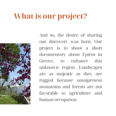And so, the desire of sharing our discovery was born. Our project is to shoot a short or mid-length documentary about Epirus in Greece, to enhance this unknown region. Landscapes are as majestic as they are rugged because omnipresent mountains and forests are not favorable to agriculture and human occupation. However, traces of civilization in Epirus date back thousands of years, and it has been and will always be a territory rich in history and traditions. We hope to show how humans have tamed this wilderness, from Ancient Greece to Modern times.