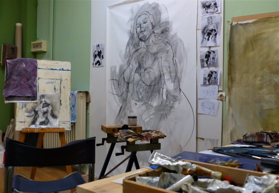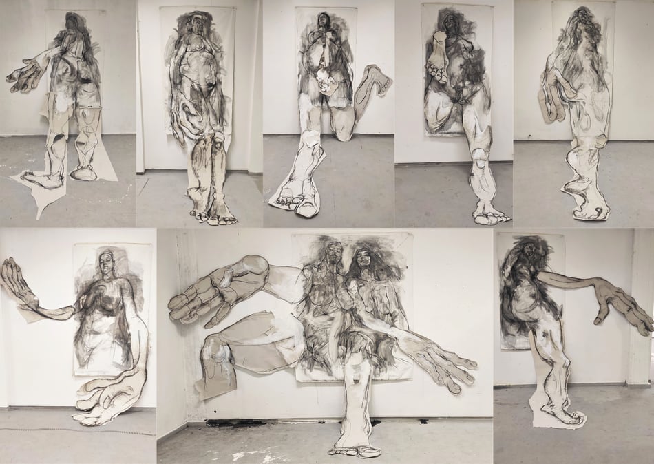 I was in my fifth year of university, and I had to come up with an idea for my final project. So, I kept painting to have inspiration. I took a picture of myself and started to sketch on a 2-meter canvas. At that time, I was painting in my room because back then we did not have this workshop. When I finished the sketch in my room and went to sleep, I was thinking about adding colors the next day. When I woke up, I felt like magic was happening. I was still sleepy, the sunlight was falling on the sketch, and the drawing felt good just the way it was. I did not want to put color on it anymore, in the sense that it would destroy the feeling I had at that moment. When I saw this that morning, it was like seeing myself empowered; I felt my femininity, my power. It was a figure looking at me and telling me “I can do this, I don’t care”. And that made me realize that I wanted to express this feeling on several canvases and to put them all in one place just for the audience to feel that.