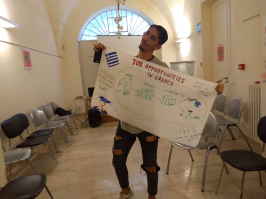 “Την Τετάρτη στις 25 Οκτωβρίου είχαμε την ευκαιρία να ταξιδέψουμε στην Ιταλία για μια βδομάδα, πιο συγκεκριμένα στο Poggiardo, ένα μικρό χωριό στην επαρχία του Lecce. Συνολικά ήμασταν επτά άτομα (μαζί με τον leader της ομάδας μας) τα οποία σταλθήκαμε εκεί με σκοπό να αντιπροσωπεύσουμε την Ελλάδα και το Κέντρο Νέων Ηπείρου σε αυτό το πρόγραμμα, και να συναντήσουμε κι άλλες ομάδες ατόμων από Τουρκία, Λιθουανία, Βουλγαρία και Πολωνία (σύνολο 42 συμμετέχοντες).